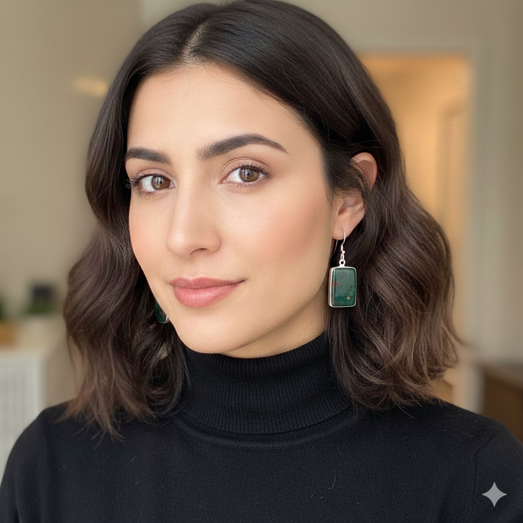 These elegant earrings feature natural Bloodstone gemstones cut in a striking octagon cabochon shape and set in premium 925 sterling silver. The rich green tones with natural inclusions give the stone a bold, earthy appeal, while the geometric cut adds a modern touch. With a graceful 1.4-inch length, these earrings create a refined drop suitable for both everyday wear and special occasions. Expertly handcrafted by skilled artisans, you will receive the same beautiful item that’s pictured.