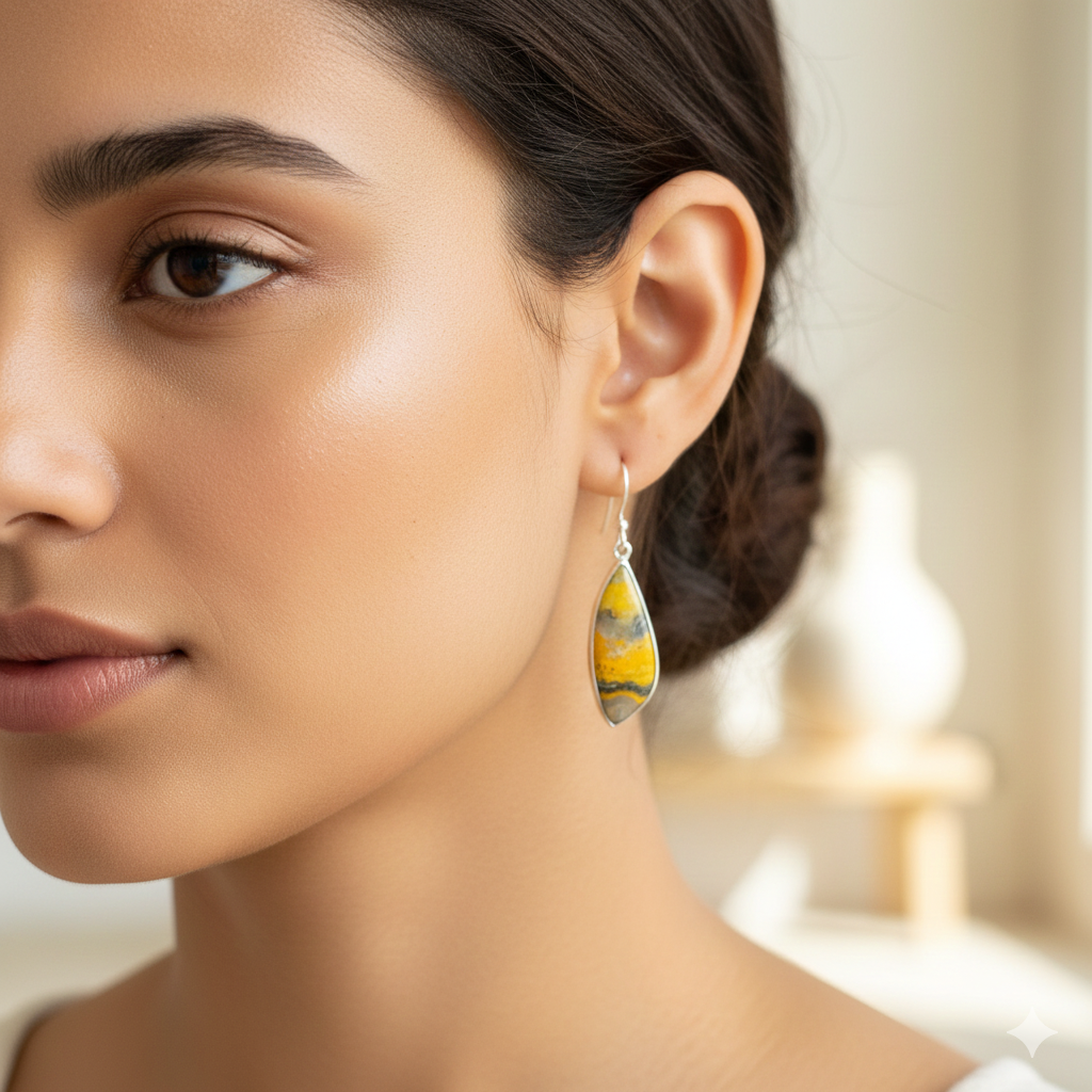 These striking earrings feature natural Bumble Bee Jasper gemstones cut in an artistic fancy cabochon shape and set in premium 925 sterling silver. Known for its vivid yellow, black, and orange patterns, Bumble Bee Jasper creates a bold and eye-catching look that stands out beautifully. With a graceful 1.8-inch length, these earrings offer an elegant drop that adds character to both everyday and statement outfits. Expertly handcrafted by skilled artisans, you will receive the same beautiful item that’s pictured.